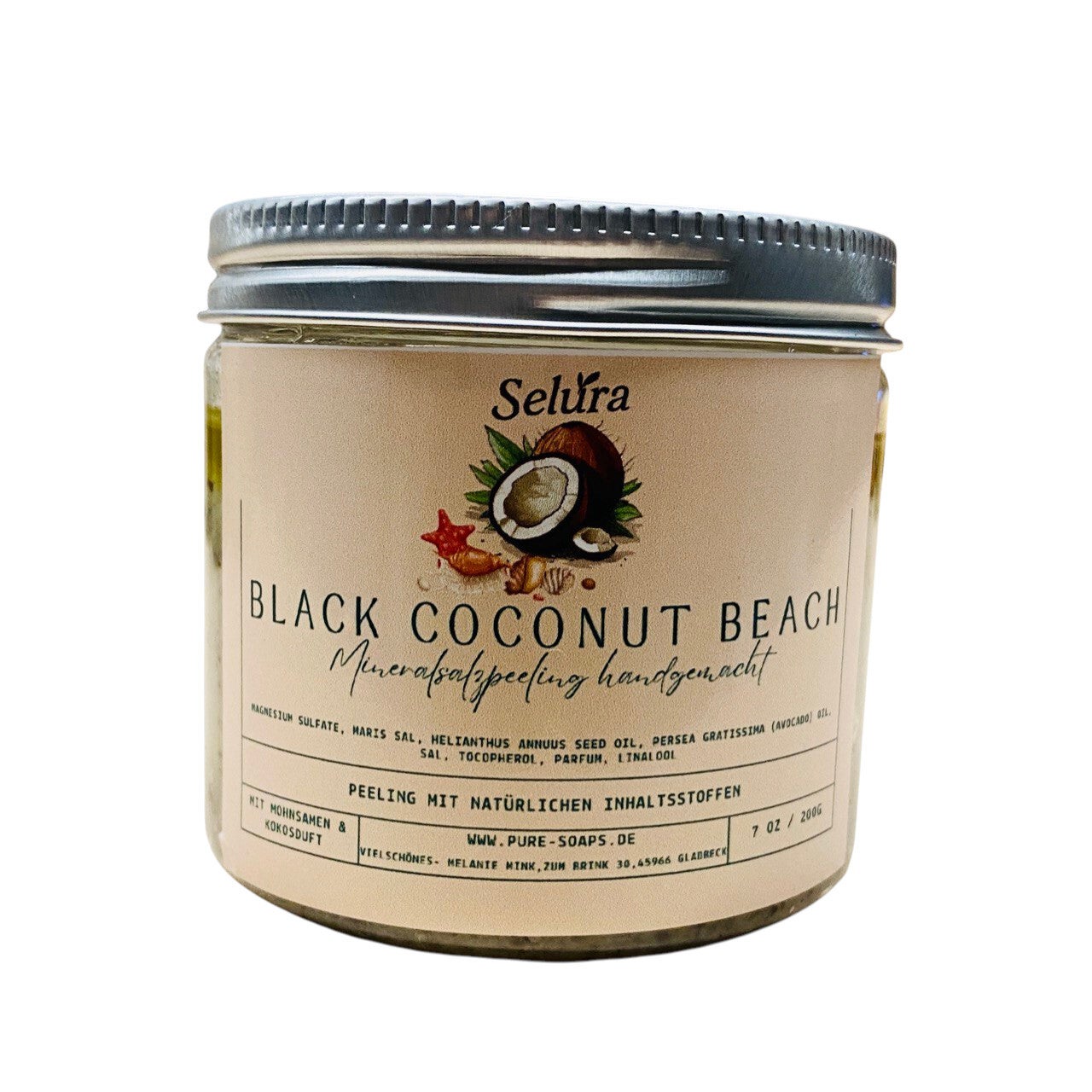 Unser Mineralsalzpeeling Black Coconut Beach bringt Urlaubsfeeling in deine Dusche: tropisch-frischer Duft nach Kokosnuss & Ananas, kombiniert mit einem intensiven Salzpeeling und verfeinert mit Mohnsamen. Die feinen Salzkristalle entfernen abgestorbene Hautschüppchen gründlich, wirken hautglättend und sorgen für ein spürbar verfeinertes Hautgefühl – ideal bei rauen Stellen an Ellenbogen, Knien und Füßen. Die Mohnsamen geben zusätzlich einen sanften Massage-Effekt und unterstützen ein ebenmäßiges Hautbild.